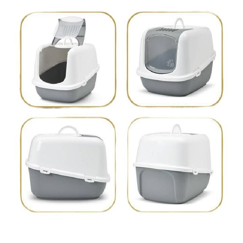 ظرف خاک مسقف بهترین انتخاب ظرف خاک برای محیط های بسته و کوچک مثل منزل می باشد.این ظرف خاک محصول کشور ترکیه از بهترین متریال و کیفیت پلاستیک ساخته شده است. جنس پلاستیک مقاوم و ضد حساسیت برتری این محصول میباشد. همراه داشتن بیلچه برای نظافت آسان خاک شما رو از خرید بیلچه بی نیاز میکند. ظرف خاک مسقف باعث میشود که گربه شما استرس کمتری رو در هنگام دفع تجربه کند زیرا اطراف آن بسته است و حس آرمش و امنیت بیشتری به گربه شما میدهد. سایز اسمال دهانه ورودی ظرف خاک 22 در 20 است و برای استفاده بچه گربه و گربه بالغ با جثه نرمال قابل استفاده می باشد. این طرف خاک بزرگترین سایز ظرف خاک موجود در بازار برای حیوانات میباشد ظرف خاک مسقف باعث میشود گربه شما خاک کمتری رو همراه خود به خارج بیاورد که باعث میشود محیط اطراف تمیزتری را تجربه کنین. ظرف خاک مسقف برای مسافرت ها به علت جا به جایی آسان بسیار گزینه مناسبی می باشد چون میتوانید خاک را داخل همان ظرف حمل کنید. قابلیت 2 تکه شدن و استفاده به عنوان ظرف خاک ساده را نیز دارد.